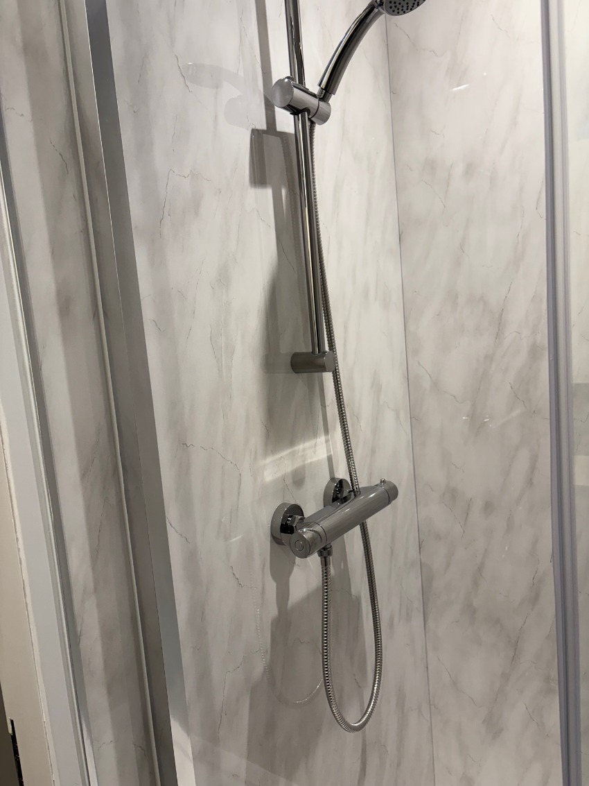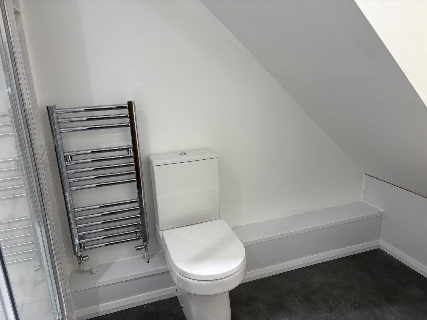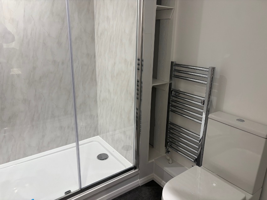 Newy fitted bathroom with shower cubicle, toilet and sink
