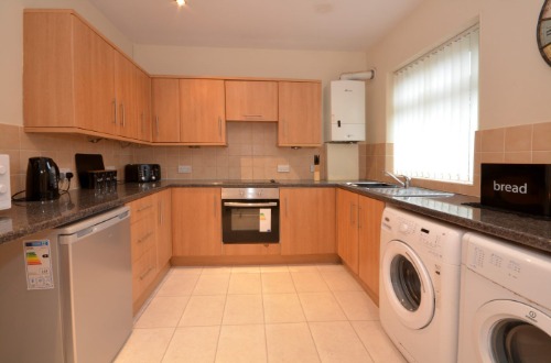 - Modern fitted kitchen with washing machine, tumble dryer, fridge/freezer, fridge, microwave, oven and hob.