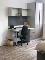 Large main room, tastefully furnished and decorated with Video entry phone, Double bed, wardrobe, drawers, built in desk, chair LCD TV and shelves.