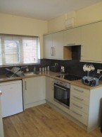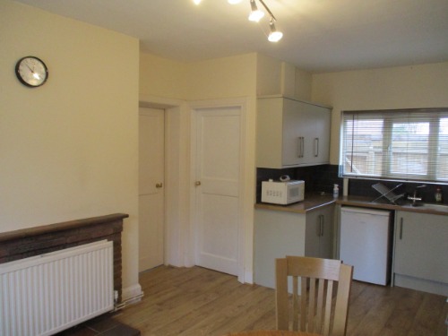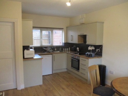 Large Kitchen/Diner with modern fitted Kitchen including built in oven, hob, fridge, microwave, Dining table and chairs