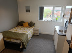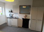 Double bedroom (single occupancy) with Double bed, wardrobe, drawers, small Kitchen area with fitted cupboards, sink, fridge and microwave