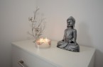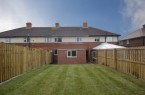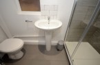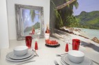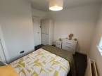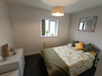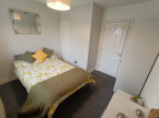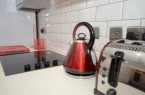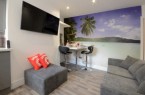 Open plan Living room / Kitchen with modern fitted Kitchen, built in oven, hob, L shaped sofa, large LCD TV, High table and stools.