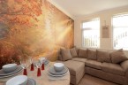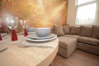 Open plan Living room / Kitchen with modern fitted Kitchen, built in oven, hob, L shaped sofa, table and stools.