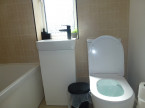 Main first floor bathroom with shower over the bath, WC and sink.