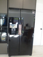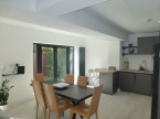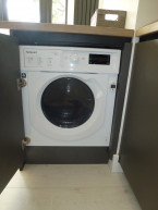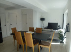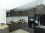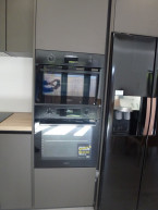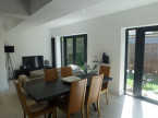 Open plan living room, dining room, kitchen with sofa, LED TV, dining table. High end kitchen featuring double oven, Induction hob, American style fridge freezer, dishwasher, washing machine.