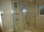 with large shower cubicle, vanity unit with mounted sink, wc, heated towel