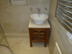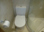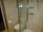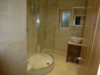 Bathroom with large shower cubicle, vanity unit with mounted sink, wc, heated towel radiators and mirrored cupboards.