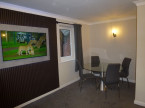 Spacious Living/Dining room with L shaped sofa, Coffee tables, Large LCD smart TV on feature wall, Large Glass and brushed chrome Dining table and chairs.